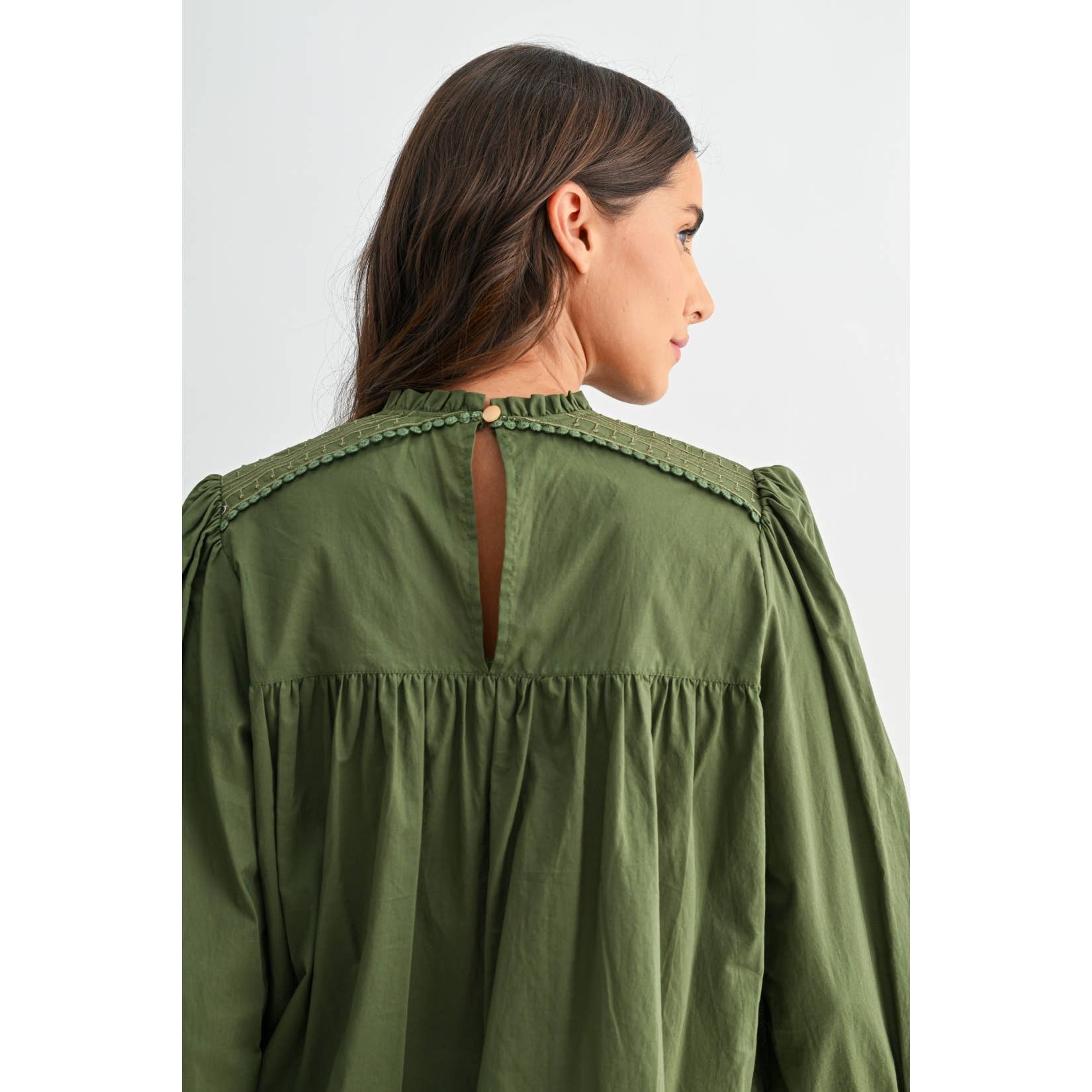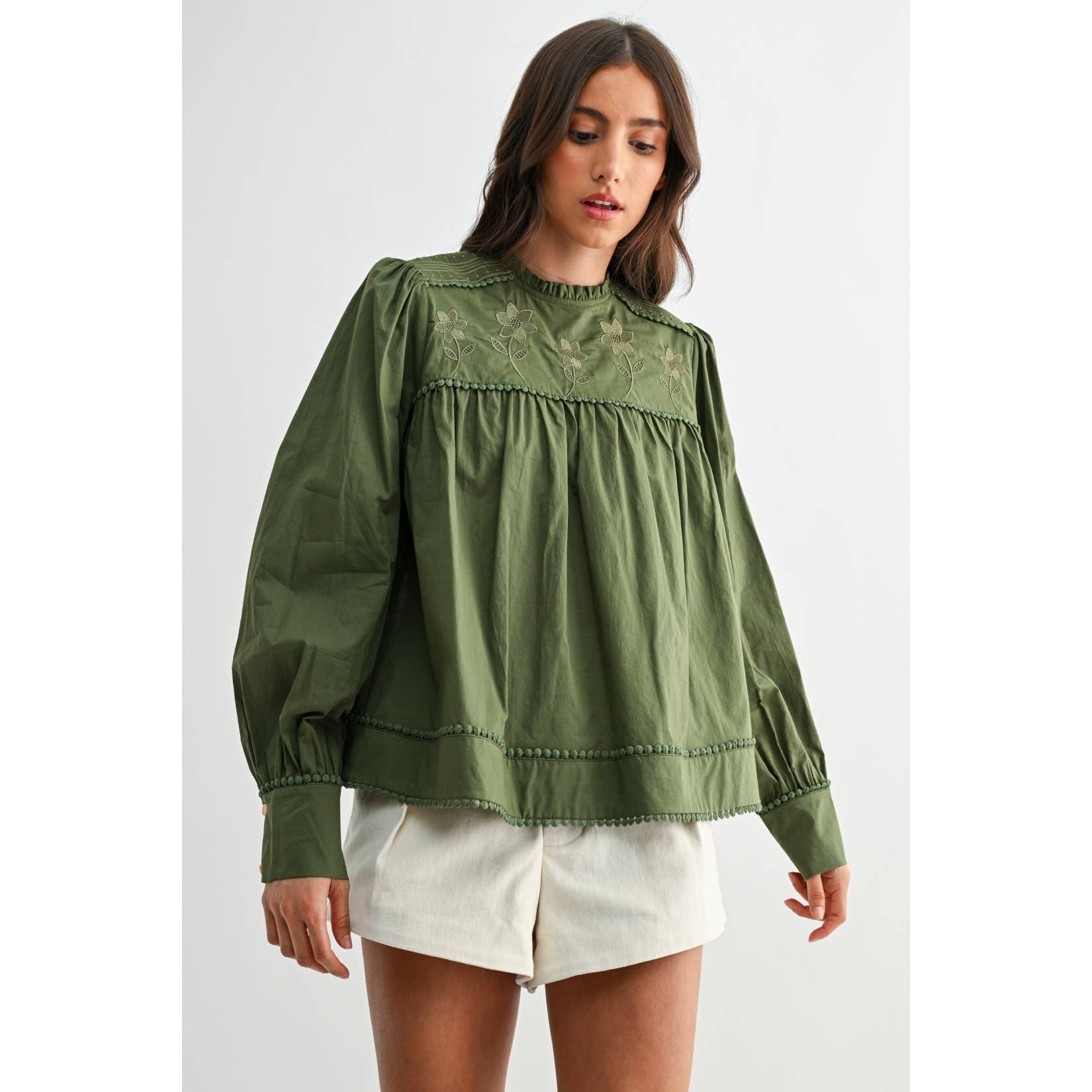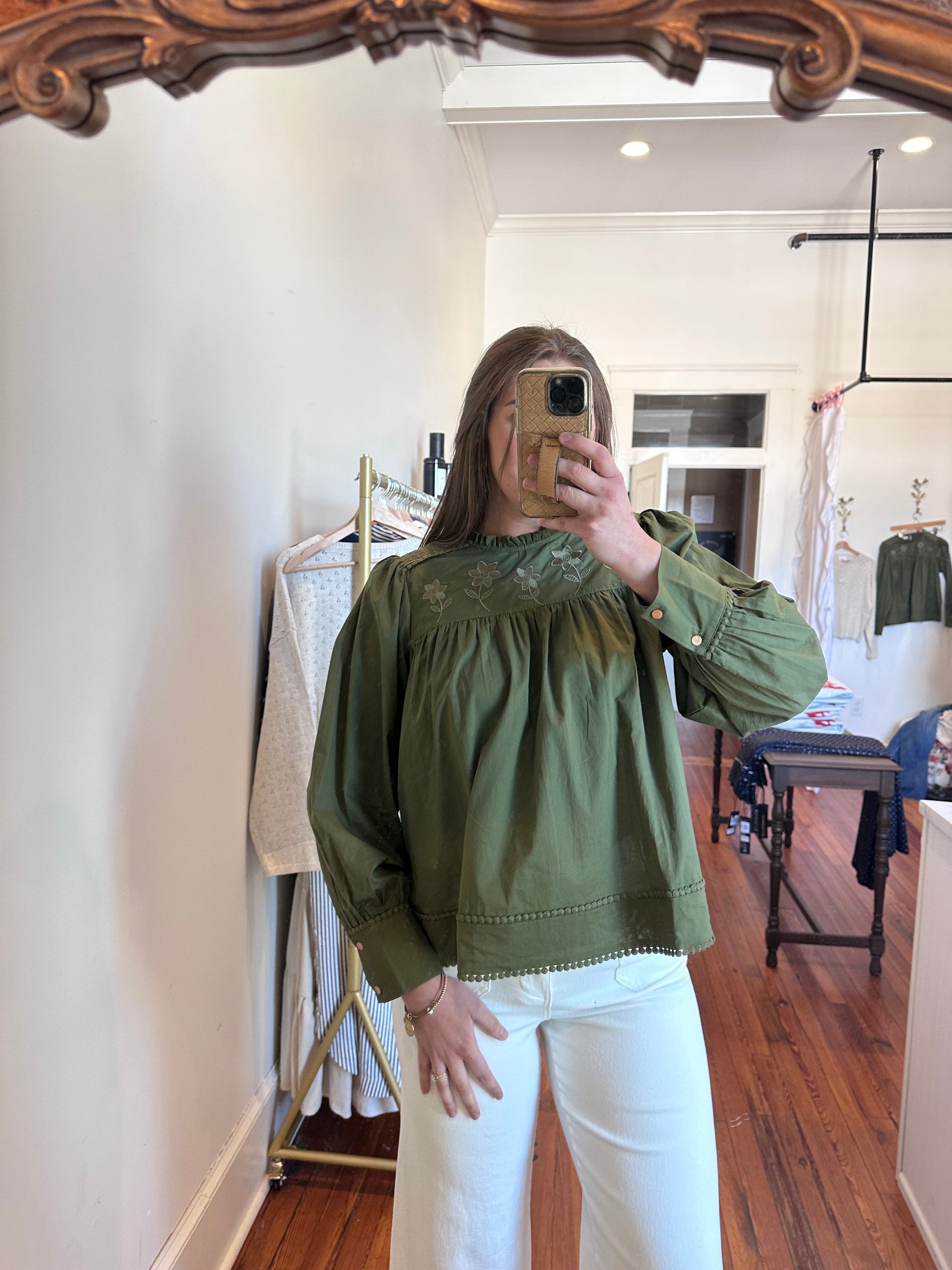 Anniston Embroidered Olive Puff Sleeve Blouse