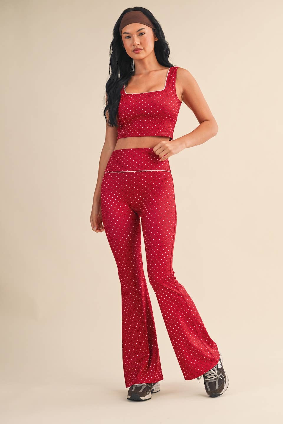 Playful meets feminine in this cropped tank, featuring a classic polka dot print and delicate lace trim. Soft, stretchy fabric moves with you, making it perfect for light workouts, lounging, or layering on the go. Flirty, functional, and effortlessly chic.